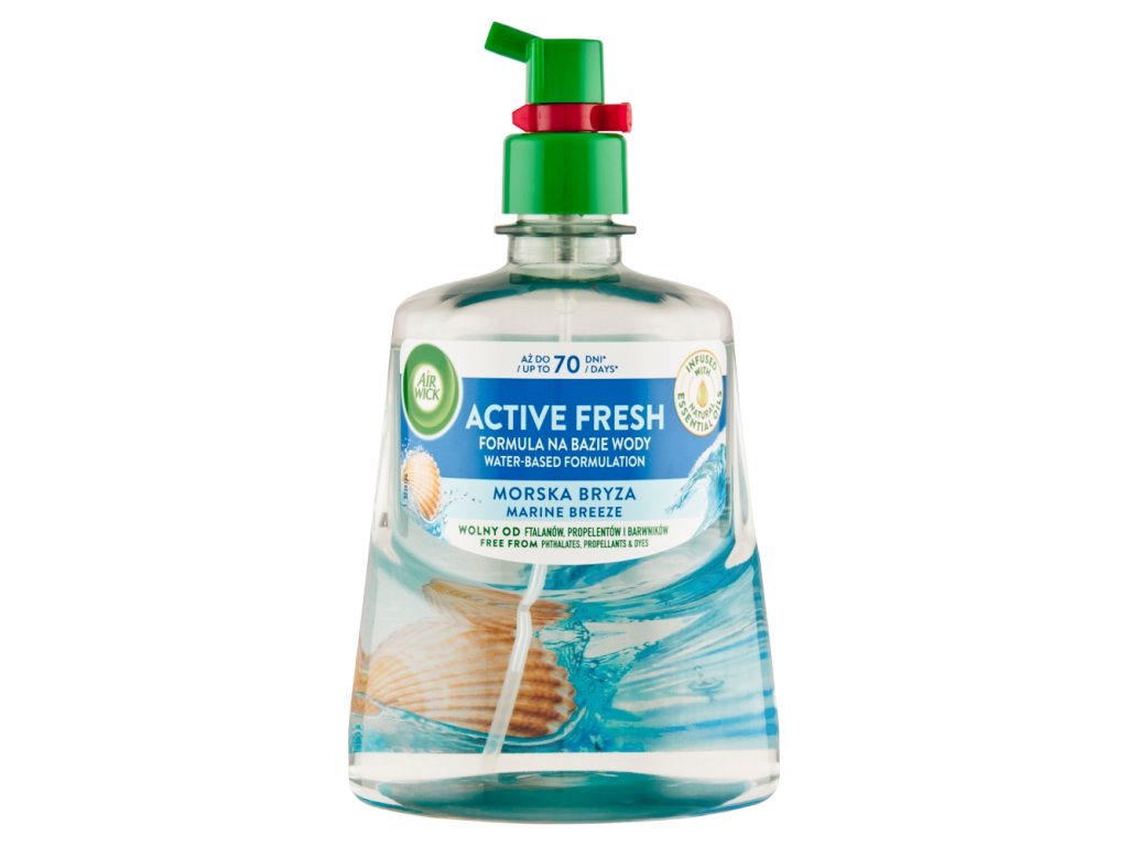 | Preparation and usage: | Instructions for use: For use with Air Wick diffuser only. Before inserting the refill into the diffuser, make sure the diffuser is turned off: "OFF" setting. Before turning on, turn the diffuser away from your face. After turning on the diffuser, the fragrance will be released automatically after 15 seconds. For safety reasons, carefully follow the instructions on the Air Wick Active Fresh diffuser packaging. |
