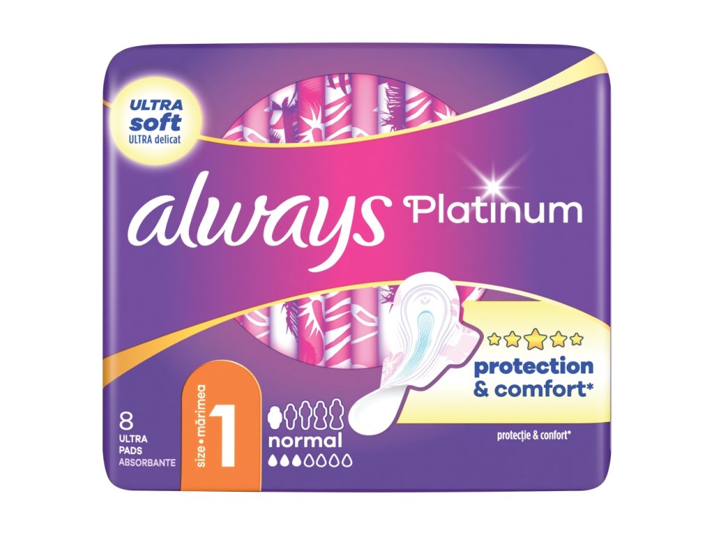 Always Platinum Ultra Normal Plus sanitary napkins (size 1) provide more comfort and better protection (compared to Always Ultra). With 1,000 soft micro-cushions that prevent leakage from the sides of the napkin and an improved core, Always Platinum provides the best protection and comfort from Always.