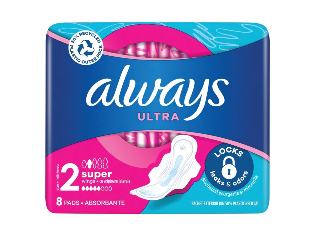Always Ultra Super Plus Sanitary Pads provide discreet and highly reliable protection during the menstrual cycle. Their core contains a special material that quickly absorbs fluid and reliably locks it inside the pad, in an amount several times higher than its own weight.