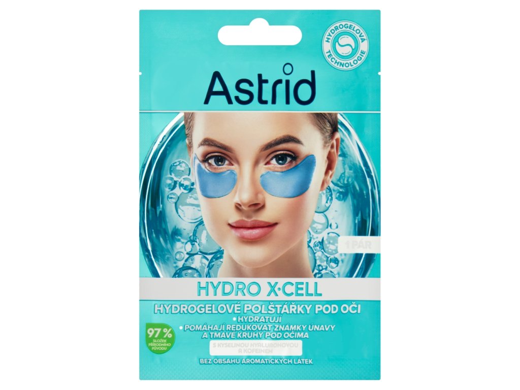 Astrid Hydro X-Cell Eye Pads with 97% ingredients of natural origin are enriched with hyaluronic acid and caffeine. Hyaluronic acid helps the under-eye area feel hydrated, giving it a rested look. Caffeine, which is known to improve blood circulation around the eye area, helps minimize puffiness and dark circles while restoring radiance.