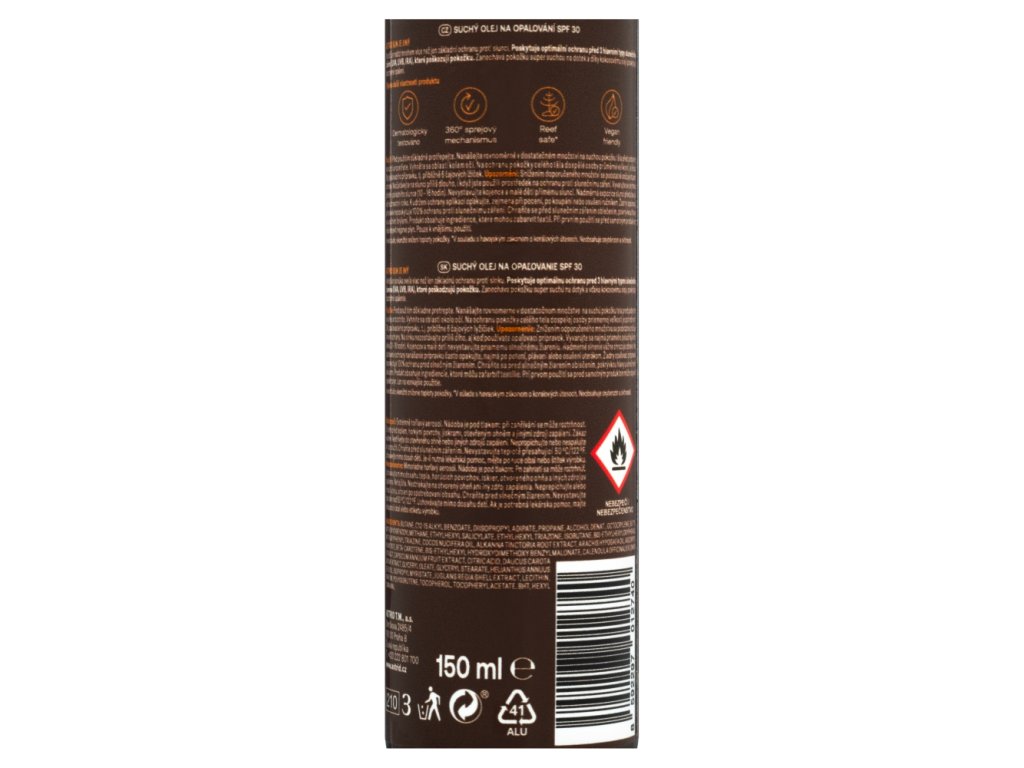 | Safety warning: | Warning: Reducing the recommended amount significantly reduces the level of protection. Do not stay in the sun for too long, even if you have applied sunscreen. Avoid direct midday sun in particular (10am-4pm). Do not expose babies and young children to direct sunlight. Excessive exposure to the sun poses a serious health risk. To maintain protection, reapply, especially when sweating, after swimming or towelling. No sunscreen product provides 100% protection against the sun. Protect yourself from the sun with clothing, a hat and sunglasses. The product contains ingredients that may discolour textiles. When first used, gas may appear before the product itself. For external use only. DANGER Danger: Extremely flammable aerosol. The container is under pressure: it may burst if heated. Keep away from heat, hot surfaces, sparks, open flames and other ignition sources. No smoking. Do not spray on an open flame or other ignition source. Do not pierce or burn, even after use. Protect from sunlight. Do not expose to temperatures exceeding 50°C/122°F. Keep out of the reach of children. If medical advice is needed, have product container or label at hand. |