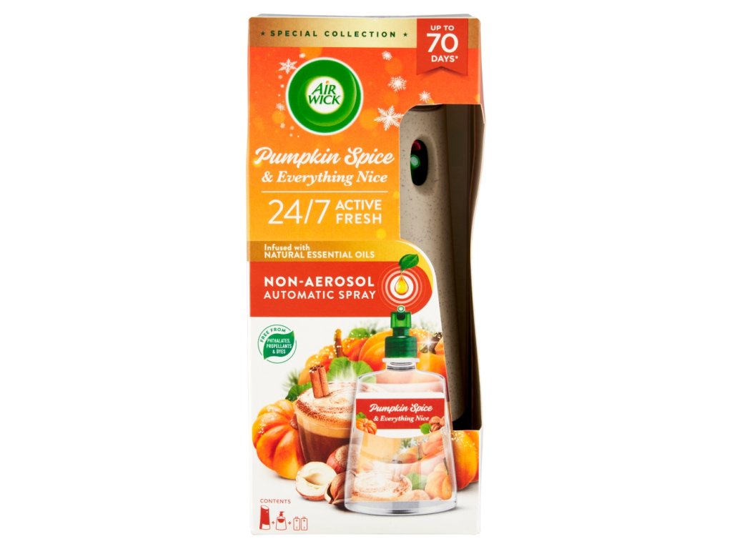 | Safety warning: | WARNING AIR WICK ACTIVE FRESH WATER-BASED AUTOMATIC DIFFUSER REFILL - PUMPKIN & AUTUMN SPICES. Flammable liquid and vapor. Keep out of reach of children. If medical advice is needed, have product container or label at hand. Keep away from heat, hot surfaces, sparks, open flames and other ignition sources. No smoking. Do not spray on an open flame or other ignition source. IF IN EYES: Rinse cautiously with water for several minutes. Remove contact lenses, if present and easy to do. Continue rinsing. Protect from sunlight. Do not expose to temperatures exceeding 50°C. Contains cinnamaldehyde. May cause an allergic reaction. INSTRUCTIONS FOR SAFE USE: Read carefully and retain for future reference. This device is battery operated. THIS DEVICE IS FOR ADULTS ONLY. This device is not intended for use by children or persons with reduced physical, sensory or mental capabilities. Use only as directed. KEEP OUT OF REACH OF CHILDREN AND ANIMALS. Use in a well-ventilated area. TURN OFF THE TIMER BEFORE INSERTING A REFILL. Read and follow the safety instructions for use on the refill. Use only with Air Wick Active Fresh refills. PLACE THE DEVICE ABOVE EYE LEVEL (AT LEAST 2 METERS FROM THE FLOOR). WARNING: THIS PRODUCT CONTAINS PARTS THAT MAY BE A CHOKING HAZARD. Use only non-rechargeable alkaline batteries. Make sure the batteries are inserted correctly according to the (+) and (-) orientation. If the batteries leak, remove them immediately and any leaked material with them. Also remove the batteries if the device is not to be used for an extended period of time. Turn off the device if you will be away for more than a week. DO NOT: Place the device near or on heat sources, open flames, any electrical equipment, or in direct sunlight (above 50°C). Expose the batteries to water, fire, or high temperatures. Short circuit. Attempt to recharge the batteries. CAUTION: Intentional misuse by intentionally concentrating and inhaling the contents can be harmful or fatal. Use in well-ventilated areas. Slippery on hard surfaces. Some hard surfaces may become wet when in contact with the filling. Wipe off immediately with a damp cloth if surface comes into contact. Do not spray directly on surfaces, pets and their bedding, food, or fabrics. Extreme temperatures may occur in motor vehicles and near stoves and fireplaces. Persons with hypersensitivity to odors should use this product with caution. Air fresheners are not a substitute for good hygiene practices. FOLLOW THE INSTRUCTIONS CAREFULLY. KEEP THE DIFFUSER AWAY FROM YOUR FACE AT ALL TIMES IN USE. |