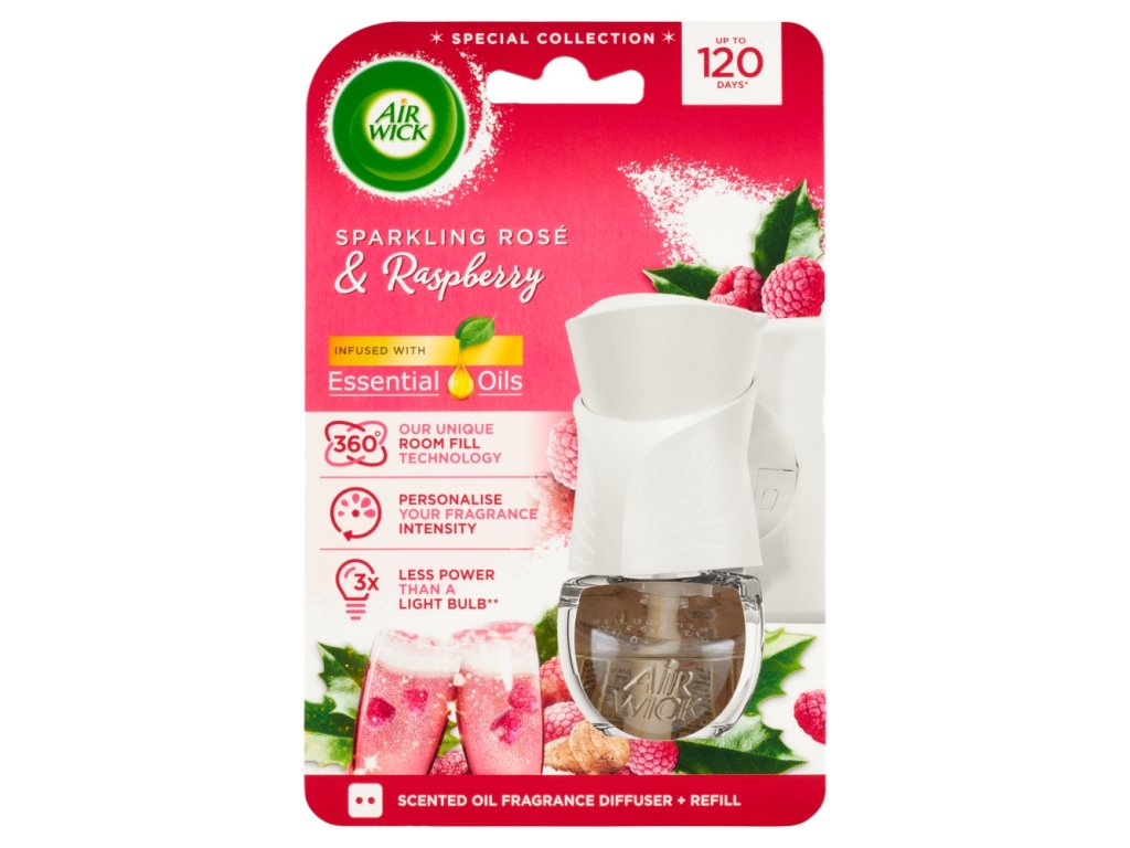 | Safety warning: | WARNING Air Wick liquid refill for electric appliance - Pink Sparkling Wine and Raspberry. Hazardous ingredients: citronellol; 4-tert-butylcyclohexyl acetate; 1-(2,6,6-trimethyl-3-cyclohexen-1-yl)-2-buten-1-one. May cause an allergic skin reaction. Keep out of reach of children. If medical advice is needed, have product container or label at hand. IF SWALLOWED: Immediately call a POISON CENTER or doctor/physician. IF ON SKIN: Wash with plenty of soap and water. If skin irritation or rash occurs: Get medical advice/attention. IF IN EYES: Rinse cautiously with water for several minutes. Remove contact lenses, if present and easy to do. Continue rinsing. If eye irritation persists: Get medical attention or treatment. Contains d-limonene; alpha-iso-methyl-ionone; coumarin; eugenol; alpha-methyl-beta-ionone; carvone. May produce an allergic reaction. READ THE SAFETY INFORMATION AND KEEP FOR FUTURE REFERENCE. ALWAYS UNPLUG THE AIR FRESHENER FROM THE ELECTRICAL OUTLET BEFORE REMOVING OR INSERTING A REPLACEMENT CARTRIDGE. DO NOT PLACE IN AREAS WHERE THE AIR FRESHENER WILL BE EXPOSED TO HARD IMPACTS. Do not use the air freshener with extension cords or multi-socket adapters. For indoor use only. KEEP IN AN UPPER POSITION. DO NOT use with wet hands or metal objects, do not place near heat sources or direct sunlight, do not place on polished, painted or plastic surfaces. DO NOT obstruct or block the airflow from the unit, do not use in small enclosed spaces for animals without adequate ventilation or use continuously - unplug overnight. Leave 50 cm of space above and around the diffuser during use. USE ONLY WITH AIR WICK REFILLS - USING OTHER REFILLS MAY CAUSE A TOXIC OR FIRE RISK. THIS APPLIANCE IS FOR ADULTS ONLY. This appliance is not intended for use by children aged from 8 years and under and persons with reduced physical, sensory or mental capabilities or lack of experience and knowledge. Children should be supervised to ensure that they do not play with the appliance. People with fragrance sensitivities should use this product with caution. Air fresheners are not a substitute for good hygiene practices. Use in a well-ventilated area. |