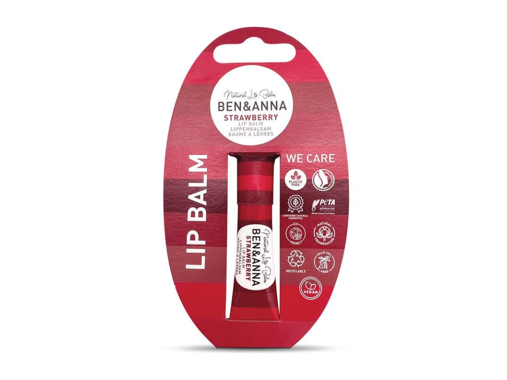 Strawberry Lip Balm Strawberry Lip Balm will transport you to a garden full of juicy strawberries. Its tempting scent and nourishing formula make it an irresistible companion. Immerse yourself in the world of strawberries while enjoying the care your lips deserve. In a plastic-free paper package. Contains 6 g. Not tested on animals, does not contain PLASTIC, suitable for VEGANS. Contains, among other things: Vitamin E Castor oil In addition, the Ben&Anna brand also supports the One Earth – One Ocean organization, whose initiative is to clean the ocean from plastic waste. Ben&Anna is proud of the VEGAN, NATRUE, ICADA certificates.Additional parameters