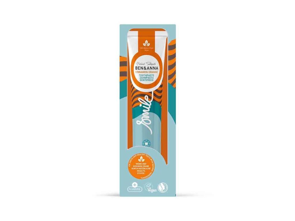 Ideal for the whole family Ben&Anna toothpaste with a fruity orange flavor and a delicate cinnamon aroma will suit the whole family. 100% certified natural cosmetics vegan without parabens, phthalates and microplastics supports ocean cleaning contains sodium fluoride (1450 ppm F-) Thanks to the power of basil leaf extracts, the oral cavity is protected from germs and bacteria and keeps breath fresh. For naturally healthy teeth and fresh breath! Usage: Apply a small amount of paste to a toothbrush. Brush your teeth for 2 minutes. Rinse your mouth well, do not swallow. Warning: Not suitable for children under 7 years of age. Store at a temperature of +5 °C to +25 °C. Packaging made of recycled material. Made in Latvia.Additional parameters