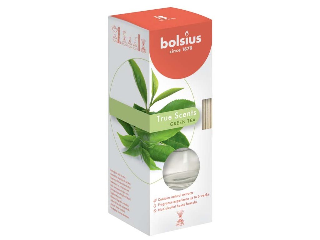 The elegant Bolsius scented diffuser with the scent of Green Tea will become a favorite decoration in your home. Let your home be filled with the light and fresh scent of green tea, which will beautifully scent your home. The scent will begin to be released after inserting the sticks into the diffuser. You can adjust the intensity of the scent by the number of sticks in the diffuser. The scented diffuser is also suitable as a gift for your loved ones. Volume 45ml. Fragrance time 4 - 6 weeks. Scent intensity: gentle.Additional parameters