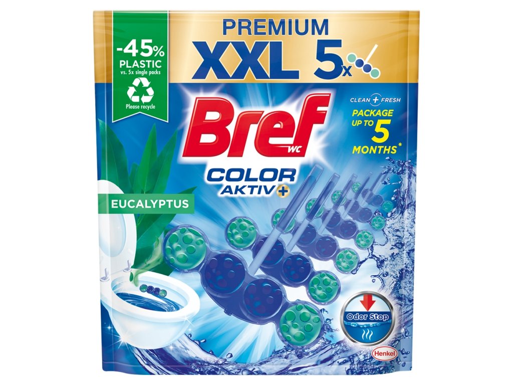 Bref Blue Aktiv = 1. Perfect cleanliness between each flush thanks to the active substances contained in blue water 2. Effective against limescale 3. Perfect freshness 4. Perfect hygiene.