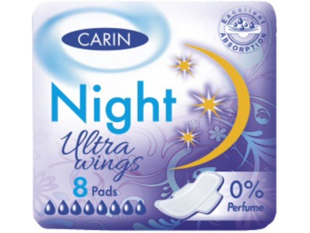 Carin Night ultra wings sanitary pads offer even more comfort and reliable protection. Ultra-thin individually wrapped pads with wings give you a feeling of cleanliness and freshness thanks to special technology. Carin sanitary pads are mainly intended for night use.