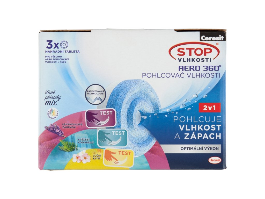 | Preparation and usage: | Instructions for use 1.a To open the device, press the "OPEN" button on the top of the device. 1.b Press the buttons marked "PUSH" at the same time and fold the top of the device. 2. Open the bag with the tablet. 3. Insert the tablet into the folded part of the device with the blue side down. Close the device. 4. When the water in the tank reaches the marked line, open the drain valve and pour the solution into the toilet. Aero 360° System For the most effective result, use Aero 360° tablets together with the Aero 360° moisture absorber. 10 m² bathroom, 20 m² room. |