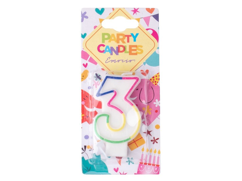 The Emocio cake candle is made of white wax with a colored rim, in the shape of the number 3. This candle can be used to celebrate a birthday, anniversary or other event. The candle has a white plastic insert that makes it easy to place on the cake. The candle should not be placed in a draft.Additional parameters