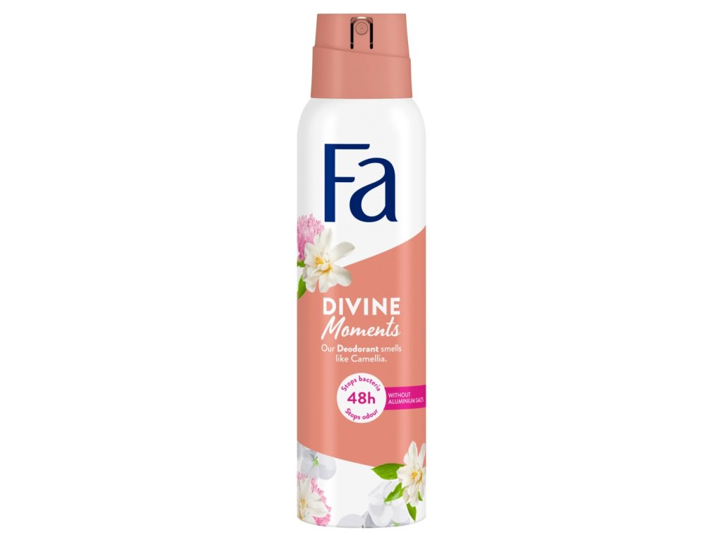 Discover Fa Divine Moments deodorant with the scent of wild camellia. Non-Stop Fresh technology for 48-hour protection . With a gentle and precise application system.