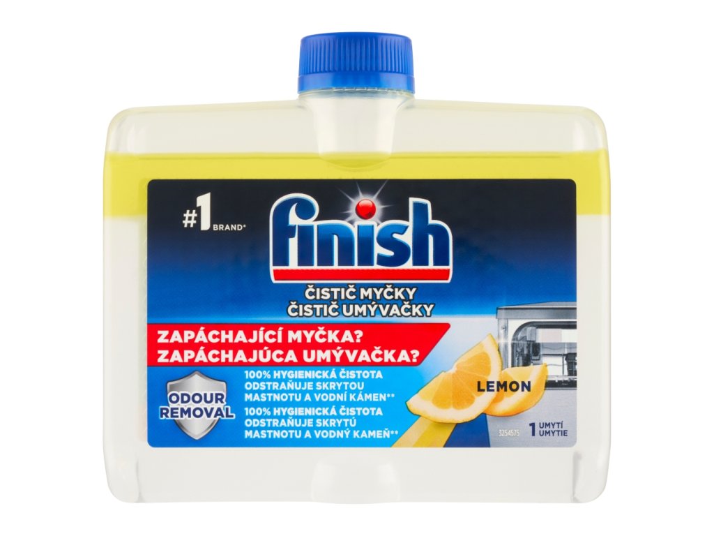 Finish Dishwasher Cleaner Lemon Sparkle . Day after day, limescale and grease build up in the filter, nozzle and pipes of your dishwasher. With Finish Dishwasher Cleaner, ensure your dishwasher is up to 100% better at removing grease and limescale . Compared to washing with just Finish All in 1 Max dishwashing tablets, 65 °C Universal program, water hardness 16° dH.
