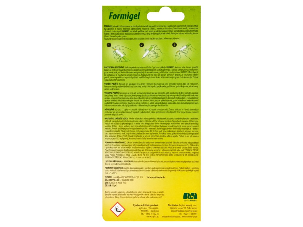 | Preparation and usage: | Remove the cartridge cap. Use biocides safely. Always read the label and product information before use. Instructions for use: Apply the gel bait from the syringe / cartridge. Apply Formigel in drops or lines (elongated drops) to areas where ants are present. We recommend washing your hands before using the bait to avoid contamination with strong odors such as tobacco, etc. Do not spray or atomize other chemical products near the area where Formigel has been applied. This could cause contamination or disgust for the ants. Do not use on wood or porous surfaces. If you cannot find a suitable surface, apply the product to a non-porous surface, such as a plastic sheet. Check the areas where the gel has been applied frequently. The product has shown a 90% kill rate in 15 days. Indoor use: Apply the gel as drops or stripes near the ant tracks or bait station, and in areas where ants are likely to be found: hollow walls, cracks and crevices in the kitchen, bathroom, under the sink, window sills, air vents, garages, attics, etc. Outdoor use: Apply the gel to areas where ants are found, such as anthills, their paths or in holes or depressions, on the edges of roofs, cornices, places with cables or pipes that penetrate buildings. Remove alternative food sources in the area that could compete with the bait. The gel must be applied out of sunlight to prevent it from drying out. Check the application sites after a few days and repeat the treatment if necessary until the colonies are completely controlled. Outdoors, the application must be repeated if atmospheric conditions affect the product (rain, exposure to direct sunlight, pollution, etc.). Although the product contains a bitter substance that makes it impossible for humans or pets to swallow it, it should be applied in areas inaccessible to pets. Dosage: 0.2 g/m2 (1 drop = 1 strip of 3 cm = 0.2 grams of bait in gel). Frequency of application: After 7 days, check the places where the gel was applied and repeat the bait application if it has been consumed. Frequency of use: 3 months after the infestation has been eliminated, the gel can be used again. |