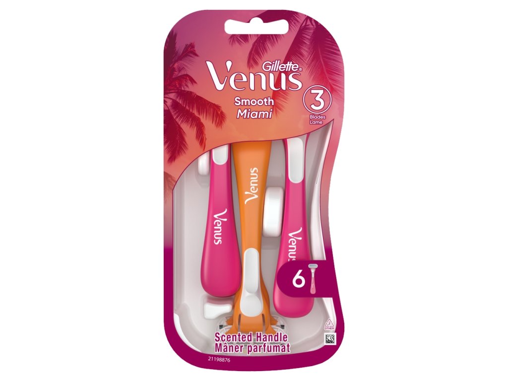 Venus women's razors are designed with the female body in mind. Venus Smooth Miami women's razors provide a smooth and close shave without effort. These women's razors have 3 contouring blades and a pivoting head that responds to even the subtlest changes in body contours. With an ergonomic soft-grip handle that fits comfortably in your hand.