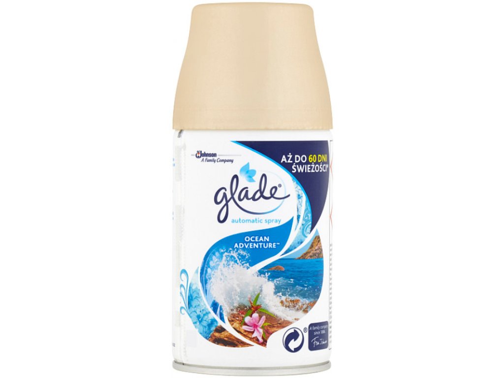 Glade Automatic Spray Ocean Adventure refill for automatic air freshener eliminates unpleasant odors and provides a fresh scent for up to 60 days when set to 36 minutes. Ideal for larger rooms. Awaken your senses with vibrant marine and citrus notes interwoven with endless waves of refreshing aromatic floral notes. Characteristics of Glade Ocean Adventure refill: scent of marine and citrus notes interwoven with aromatic floral notes new odor absorption technology quickly fills the room with a fresh scent eliminates unpleasant odors How to use Glade Ocean Adventure refill: point the freshener away from you set Automatic Spray to OFF and remove the empty refill insert a new refill with the sprayer facing outwards set the desired refresh interval. Warning for Glade by Brise refill: Extremely flammable aerosol. The container is under pressure: may burst when heated. Causes serious eye irritation. If medical advice is needed, have product container or label at hand. Keep out of reach of children.