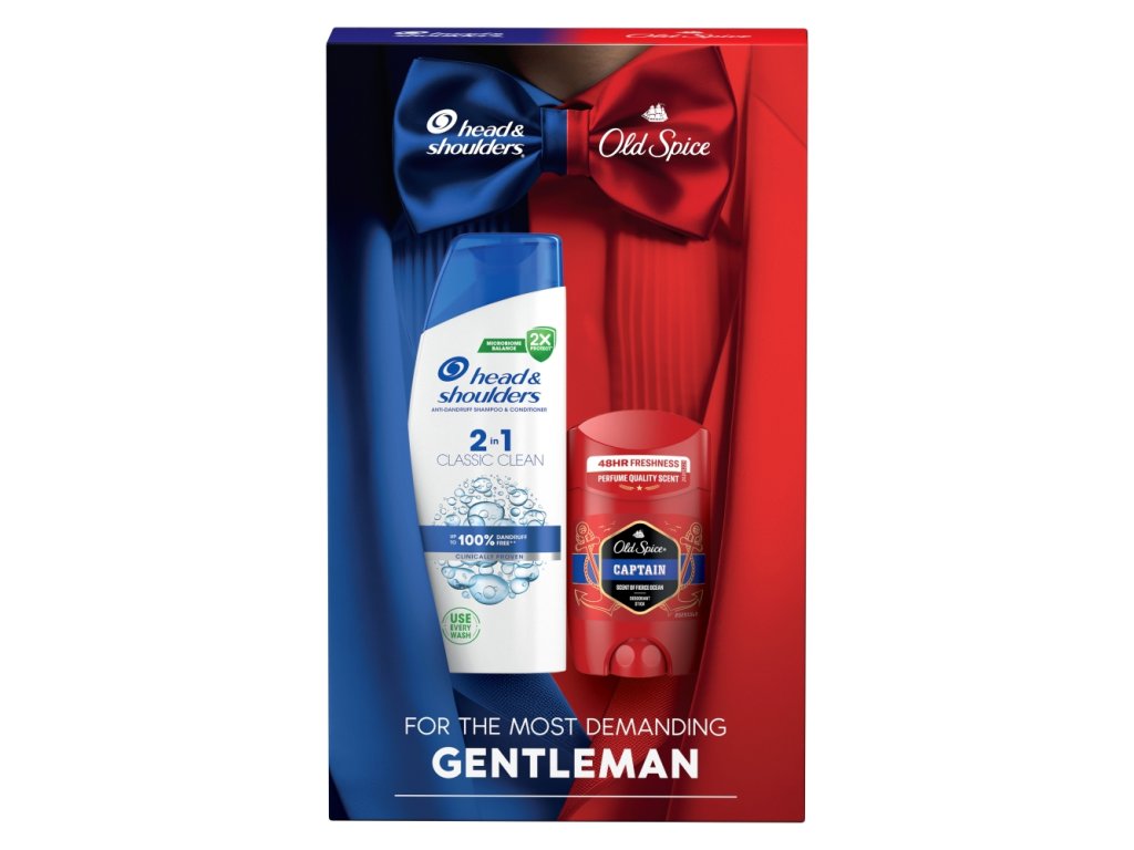 The men's gift cosmetic box contains H&S Classic Clean 2in1 shampoo 330 ml and Old Spice Captain solid deodorant 50 ml.