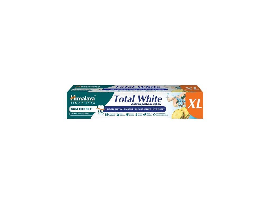 Himalaya Herbals Gum Expert Total White is a 100 ml toothpaste designed for whitening and comprehensive dental care . The paste helps remove surface stains on teeth , promotes a whiter appearance of teeth , while cleaning tooth enamel and removing dental plaque . Thanks to the content of natural herbal extracts, it also contributes to the care of gums and oral health . Himalaya Herbals Gum Expert Total White is suitable for daily use , provides long-lasting fresh breath and is intended for adults and adolescents. The product is dermatologically and clinically tested.