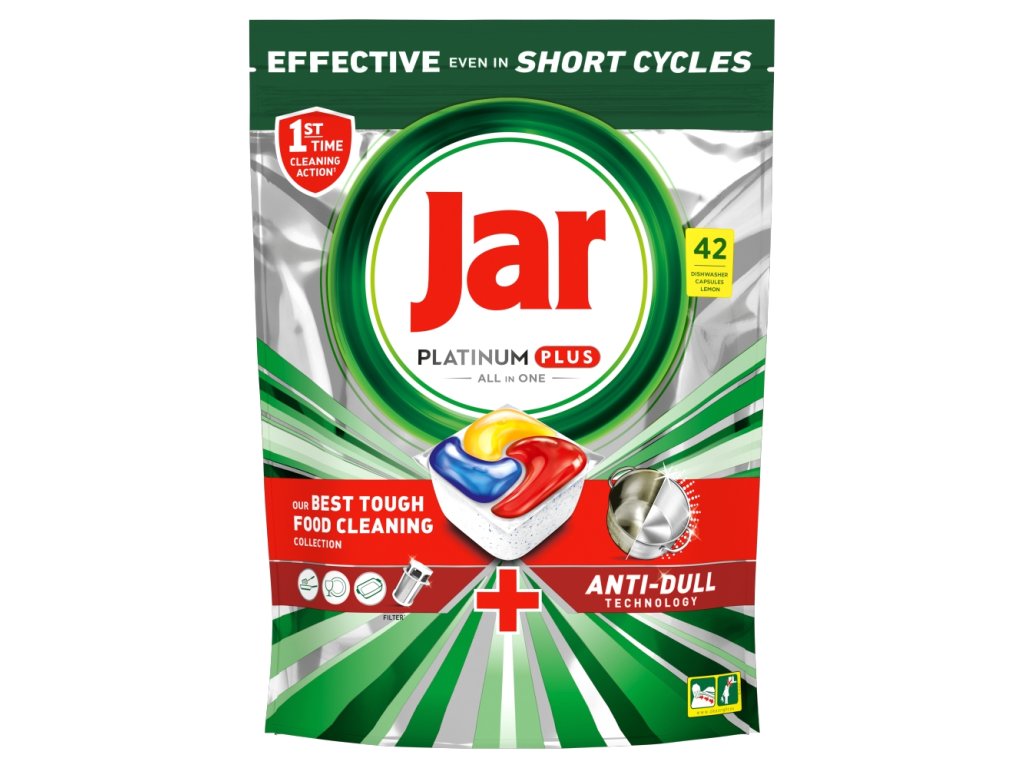 | Preparation and usage: | Place the capsule in the detergent drawer and close the dispenser. Make sure your hands are dry when handling. Do not open or separate the bags that are stuck together. Reclose the packaging after each use. For optimal results, use the detergent dispenser. If the capsule does not fit in the dispenser, place it on the cutlery basket and select a program without prewash. There is no need to add salt unless the water is extremely hard, i.e. above 26 °e (<=5% of households). With Jar, your dishwasher works efficiently without rinse aid and without salt. Wash delicate dishes with prints at lower temperatures / in short cycles. Avoid contact of silver with stainless steel. Do not wash antique / hand-painted porcelain or fine lead crystal in the dishwasher. 1 capsule = 1 wash |