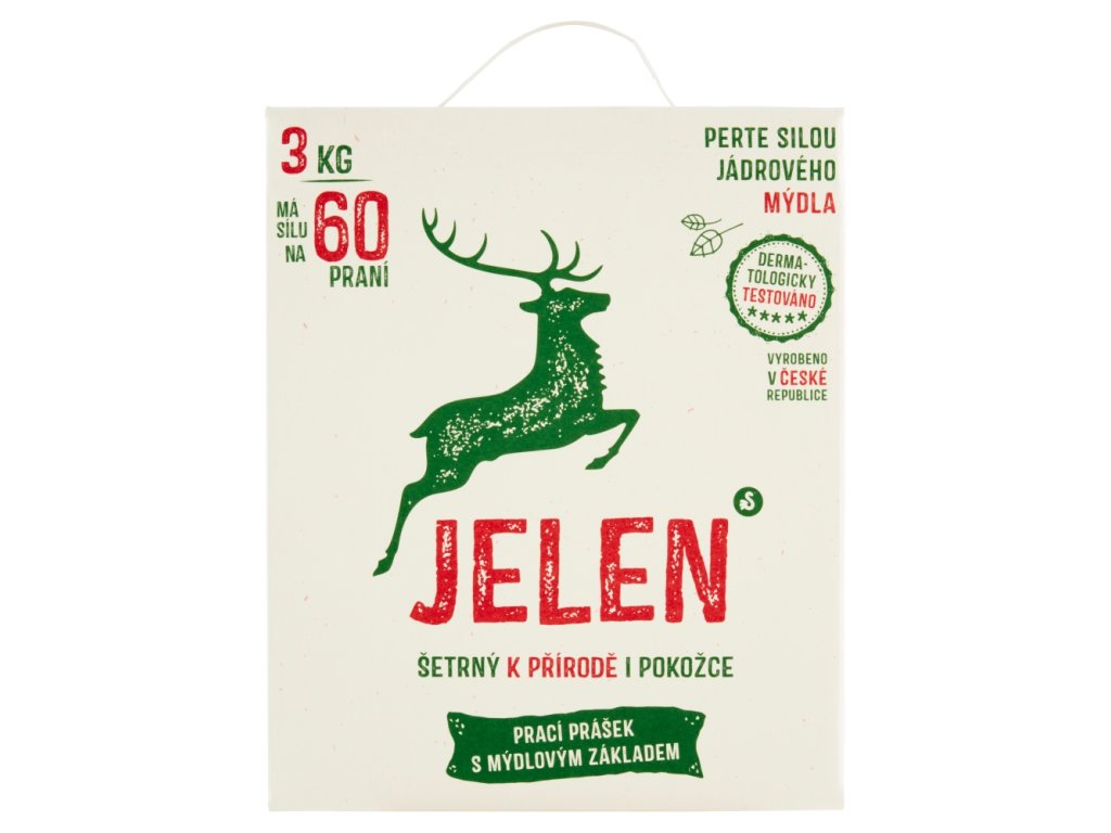 It contains exclusively natural substances that decompose quickly, completely and naturally in water. It does not contain any synthetic substances, allergenic perfumes, artificial dyes, bleaches or phosphates, but a high proportion of real soap made from fats. Years have proven that Jelen is a reliable helper for the most stubborn dirt and stains, such as cherries or chocolate, which children secretly eat in duvets. Jelen washes both colored and white laundry well. Enough for 60 washing machines.