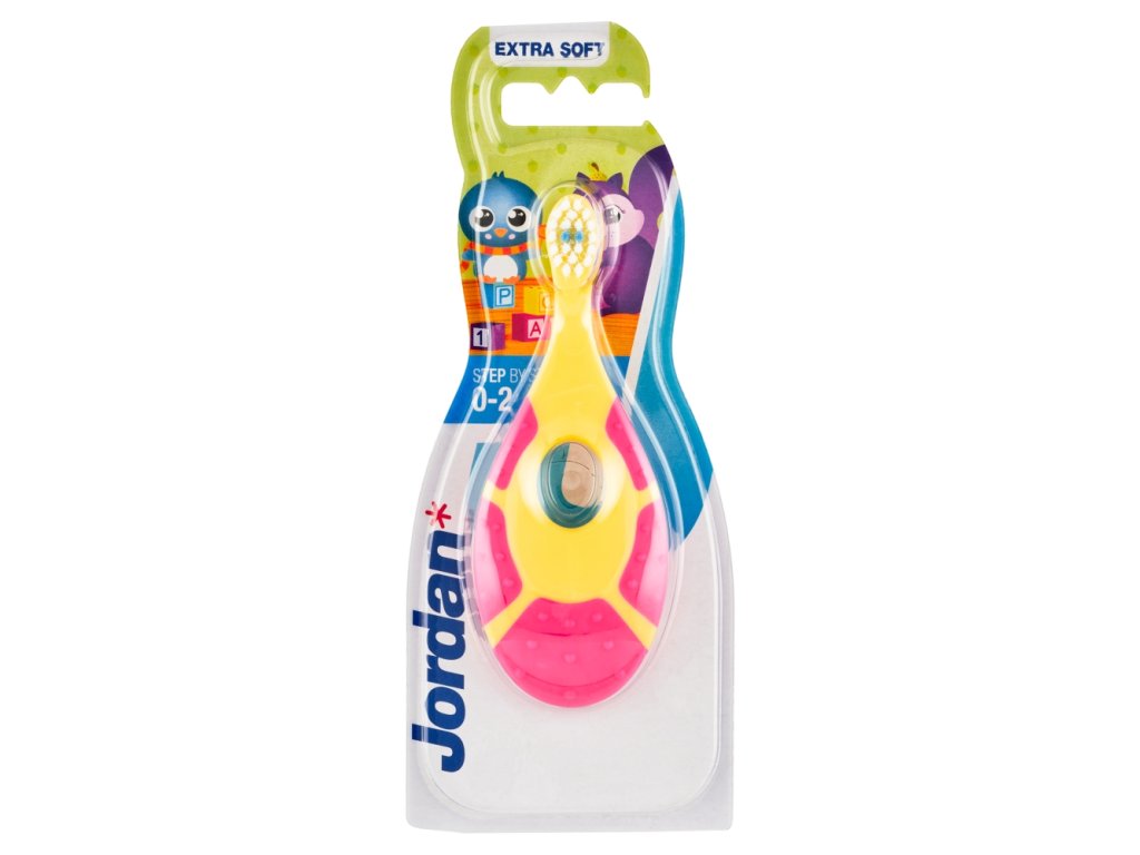 Jordan Step by Step children's toothbrush with a small head and soft bristles. Wide handle for comfortable holding in a child's hand and playing. The short neck of the brush and the wide handle prevent uncomfortable, deeper insertion into a child's mouth.