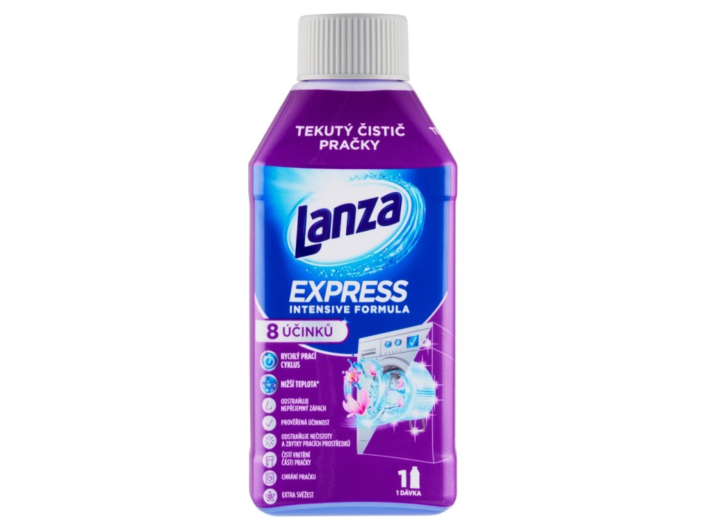 | Preparation and usage: | For optimal results, use once a month and follow these instructions: 1 Make sure the washing machine is empty. 2 Pour a small amount of product onto a sponge and clean the detergent drawer by hand. 3 Pour the contents of the bottle into the detergent drawer. 4 Run the empty washing machine on a standard cotton cycle at 40°C. 5 After the empty cycle has finished, remove any remaining dirt from the drum and seals with a sponge. For best results when cleaning the inside of your washing machine for the first time, run two quick cycles with the machine empty at 40°C and use one full bottle of Lanza Express Liquid Washing Machine Cleaner for both cycles. |