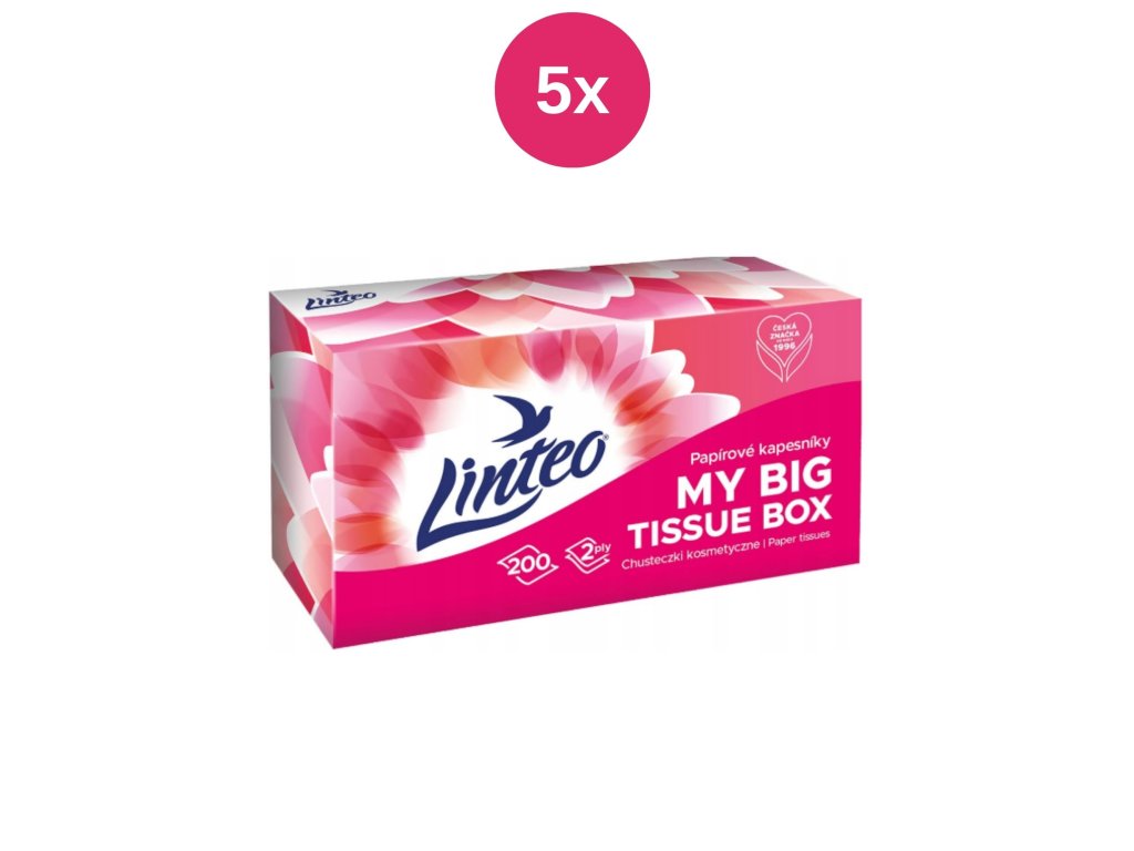 Fine white two-ply Linteo paper handkerchiefs guarantee you high fineness, softness and strength. These paper handkerchiefs are made of 100% cellulose . There are 200 pieces in a box with modern decoration, and the carton contains boxes in two colors: pink and green. The choice of color is not possible.