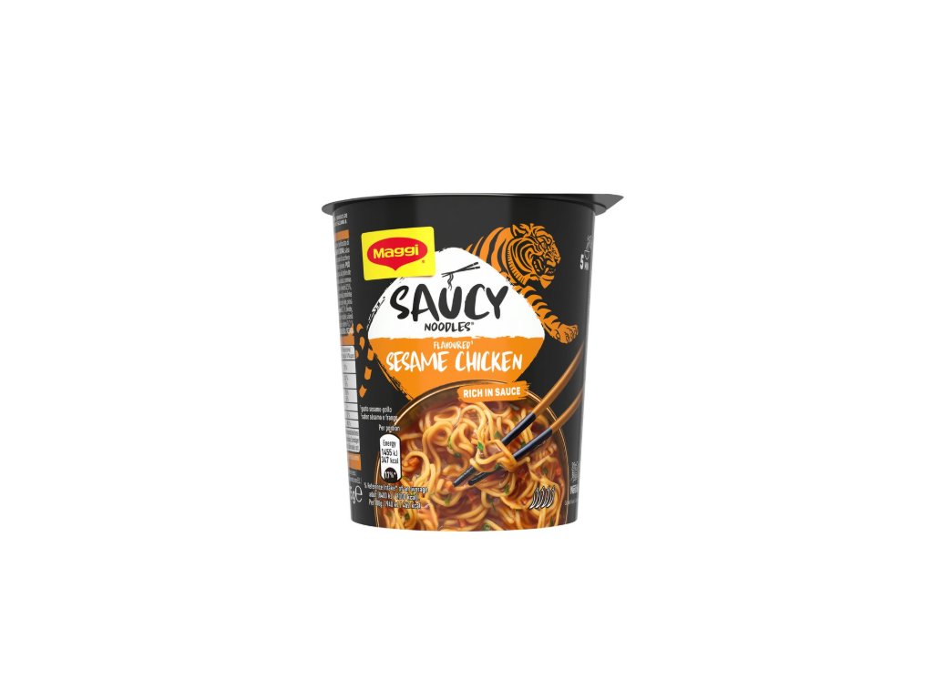 Maggi Saucy Noodles Sesame Chicken Flavoured is a delicious snack that is ready to serve in no time and does not require many accessories: Practical preparation directly in the cup and without the need for dripping - quick and easy. The shortest route to popular Asian cuisine leads directly to your own kitchen, to a noodle meal in a practical cup.