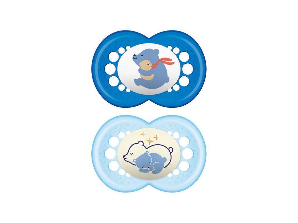 Perfectly coordinated design for day and night The MAM Day & Night pacifier has a perfectly coordinated design for day and night. A convenient package of two pacifiers in a practical sterilization box. The button of the night pacifier glows in the dark, so parents and children can easily find it. The pacifier has a symmetrical shape and therefore always adapts perfectly to the child's mouth. Thanks to the button, it can be easily and quickly grasped and also simply attached to the strap. The innovative MAM teat is as soft as skin and is easily accepted by children. The pacifier is gentle on the skin thanks to large air holes and also the unique MAM dimples. MAM pacifiers were developed together with dental experts for healthy tooth development. The images on the pacifiers may not correspond to the photos, as stock is constantly changing. It is possible to choose a color variant, which please indicate in the notes.Additional parameters