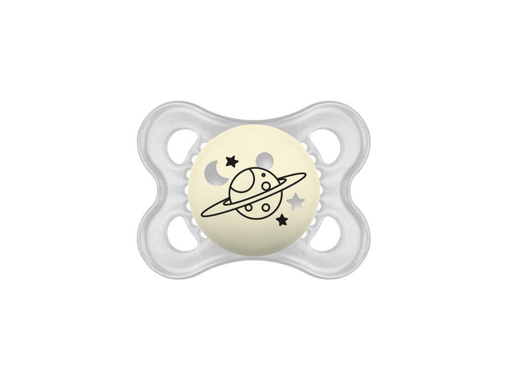 Orthodontic pacifier developed for night use MAM Night pacifiers are specially developed for night use - the pacifier button glows in the dark, so that parents and children can easily find it even at night. MAM orthodontic pacifiers are developed in close cooperation with leading medical experts for the healthy development of teeth and gums. The flat symmetrical teat made of high-quality silicone imitates the mother's breast during breastfeeding and thus supports the natural sucking reflex. In addition, it always fits correctly in the baby's mouth. 94% of babies accept the MAM SkinSoft™ silicone teat, which is as soft as baby's skin (market research 2010-2019, tested with 1,463 children in 6 countries). The pacifier is gentle on baby's skin thanks to the large ventilation holes in the pacifier collar, which allow better air flow around the mouth and thus help reduce skin irritation caused by trapped saliva. The button makes the pacifier easy and quick to grip and also easy to attach to the strap. All MAM products are made from BPA and BPS-free materials.Additional parameters