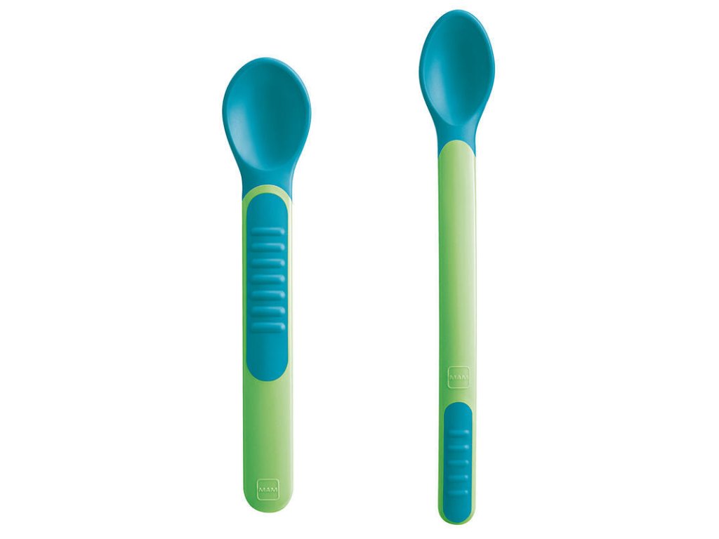 Changes colour when food is too hot The two-stage MAM Feeding Spoons & Cover with protective cover supports baby's development and helps train gross and fine motor skills. Baby learns to eat independently with a spoon in 2 stages: Stage 1 - long spoon: easily reaches the bottom of deeper glasses and can be held together. Stage 2 - short, wide spoon: designed for small baby hands - ideal for independent holding. The tips of the spoons are heat-sensitive: Changes colour when food is too hot. The protective cover is compact and keeps clean and used spoons hygienically separated thanks to two compartments.Additional parameters