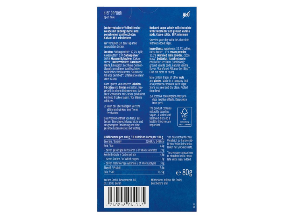 Xylitol 32.7%, cocoa butter, cocoa mass, cream powder 13%, skimmed milk powder 10.5%, clarified butter, hazelnut cream, emulsifier (sunflower lecithin), salt, ground vanilla, natural vanilla flavor.