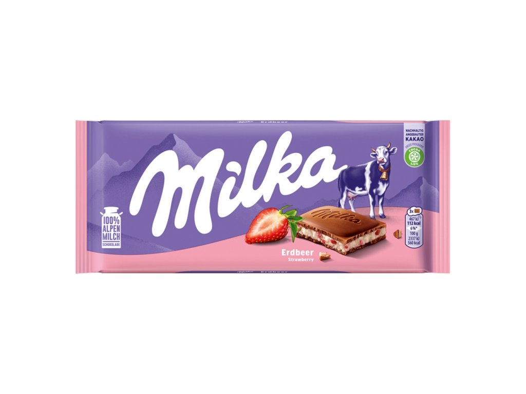 Milk chocolate made from Alpine milk with a creamy filling (51%) with strawberry flavor.