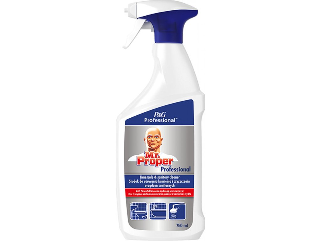 Mr. Proper Professional limescale remover and sanitary cleaner is ready to use in spray form . It leaves surfaces clean and treated so that they remain shiny for a long time . The effective polymer system creates an invisible protective film on the surface, which ensures a long-lasting shine. The acidic pH formula helps prevent limescale formation .