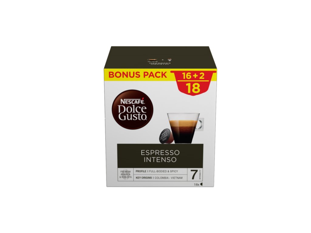 Intense medium-dark roast coffee in a small 50 ml cup. Intensity 7/11. A distinctive coffee with hints of red summer fruit, spicy pink pepper and a rich velvety crema. A fine blend of Robusta beans with South American fruity Arabica beans. The coffee is kept fresh thanks to hermetically sealed capsules designed for NESCAFÉ Dolce Gusto coffee machines. This means that every cup has a rich aroma. 16 capsules for 16 small NESCAFÉ Dolce Gusto Espresso Intenso drinks.