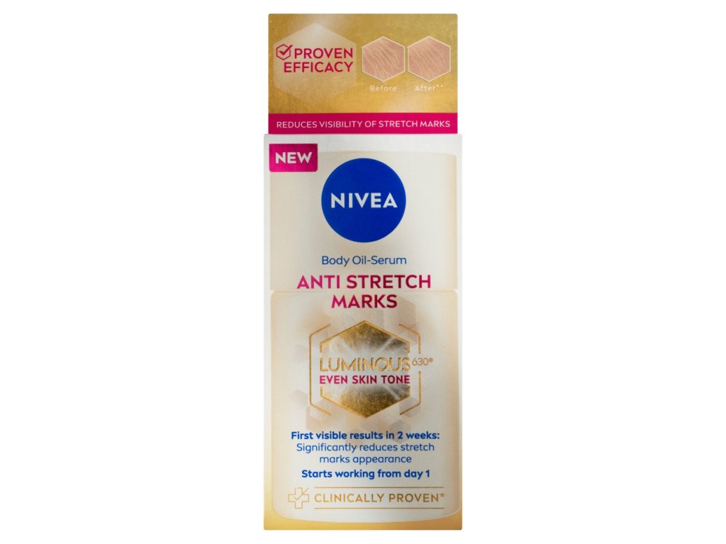Leave worries about swimsuits and short skirts behind. The oil serum will caress your body and soul. Its highly effective formula contains the patented active ingredient LUMINOUS630, which evens out skin tone and significantly reduces the visibility of pigment spots and stretch marks caused by pregnancy or hormonal and weight changes. With regular massages, it also helps prevent new stretch marks and also works on older stretch marks. You will enjoy the immediate feeling of smooth skin for up to 48 hours, and you can look forward to the first visible results that will boost your self-confidence after just 2 weeks. Even better results will come after a month of regular use.
