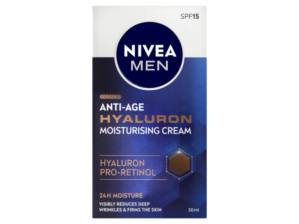 NIVEA Hyaluron Anti-Wrinkle Hydrating Face Cream for Men contains pure hyaluronic acid . It activates skin cells, thereby reducing existing wrinkles and restoring firmness to your skin. At the same time, it ensures that the skin is hydrated for up to 24 hours and protected from the sun thanks to SPF 15. Choose firm, fresh skin and try: NIVEA MEN Hyaluron Anti-Wrinkle Hydrating Face Cream.