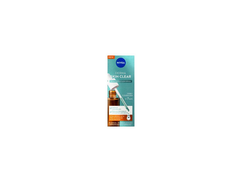 Nivea Derma Skin Clear Rebalance & Clear serum with hyaluronic acid, provitamin B5 and niacinamide is specially developed for irritated and stressed skin prone to imperfections.Additional parameters