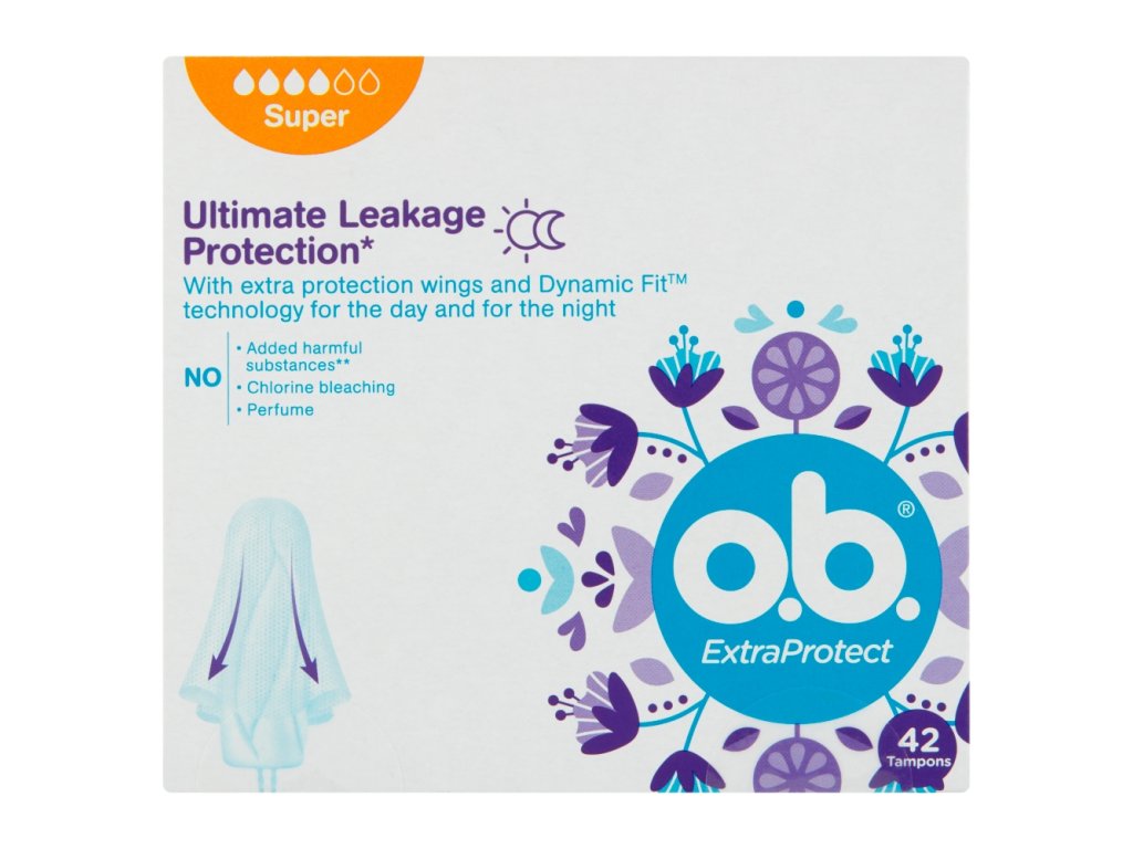 ob ExtraProtect super tampons combine two key technologies for up to 100% protection against leakage, day or night: - SilkTouch wings for extra protection gently unfold to capture fluid that regular tampons might not. At the same time, the unique Dynamic Fit technology adapts to the shape of the body and the locking grooves help to effectively guide fluid inside the tampon.