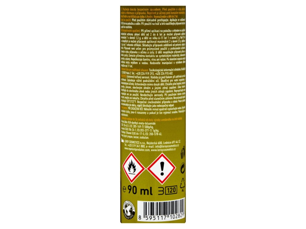 | Safety warning: | Use biocides safely. Always read the label and product information before use. The repellent is effective against mosquitoes for at least 8 hours and against ticks for 4 hours. Do not use on children under 2 years of age. Additional safety precautions: When applied directly to the skin, in order to ensure sufficient health protection for children from 2 to 6 years of age, the product can be applied no more than 1.3 g once a day, for children aged 6-11 years, 2 g once a day. For those over 12 years of age and for adults, the product can be applied no more than 2.5 g twice a day. The application of 1 g is about 1 second of spraying. The product is not intended for industrial use and professional users. Avoid contact with the eyes and mouth. Do not apply the product directly to the palms and fingers of children. Avoid direct contact with synthetic materials, painted surfaces and plastics. It does not damage cotton, wool or nylon. After exposure, wash the treated areas with soap and water. Do not allow children under 11 years of age to handle the product. Emergency telephone number: Toxicological Information Centre, Na Bojišti 1, 128 08 Prague 2. Tel.: +420 224 919 293, +420 224 915 402. DANGER: Extremely flammable aerosol. Pressurized container: may burst if heated. Causes serious eye irritation. Harmful to aquatic life with long lasting effects. Keep out of reach of children. Keep away from heat, hot surfaces, sparks, open flames and other ignition sources. No smoking. Do not spray on an open flame or other ignition source. Do not pierce or burn, even after use. Do not inhale aerosols. Do not eat, drink or smoke when using this product. Protect from sunlight. Do not expose to temperatures exceeding 50°C/122°F. First aid: IF IN EYES: Rinse cautiously with water for several minutes. Remove contact lenses, if present and easy to remove. Continue rinsing. Active ingredient: N,N-diethyl-meta-toluamide (CAS:134-62-3, EC: 205-149-7) 500g/kg, Geraniol (CAS:106-24-1, EC:203-377-1) 1g/kg. Contains: Ethanol (CAS 64-17-5, EC: 200-578-6), (propellant) propane, butane, isobutane. |