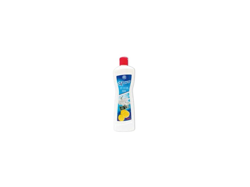 Q-power liquid cleaning sand with a fresh lemon scent cleans surfaces with the power of a powder and the softness of a cream. It removes even the most stubborn greasy and dried-on dirt from smooth washable surfaces in the kitchen and bathroom (pots, ceramic hobs, worktops, stoves, tiles, bathtubs, sinks).