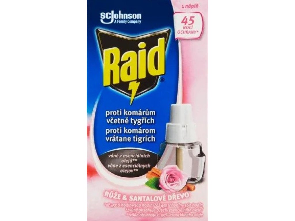 The electric vaporizer with liquid filling rose & sandalwood from the Raid brand provides effective protection against mosquitoes for up to 45 nights . It provides continuous and discreet protection without odor or smoke and protects a room up to 30 m³ . Scented with essential oils, the scent contains 0.35% essential oil. Effective even with slightly open windows and lights on.