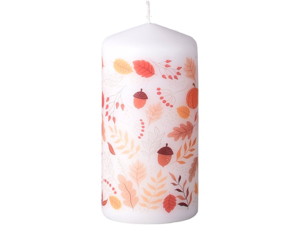Classic cylindrical candle with a delicate autumn scent and leaf print. Perfect for seasonal decorations and creating a warm atmosphere. Height 12 cm, diameter 6 cm.Additional parameters
