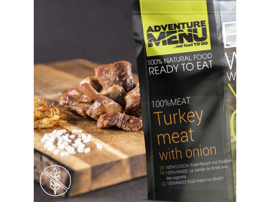 Turkey on onions is a sterilized meal on the go that stands out for the high quality of the ingredients used. It contains roasted pieces of turkey thigh meat, which has a golden crust and is juicy inside. The food has undergone a sterilization process that extends its shelf life. The meat thus retains its great taste and aroma. This processing method does not use any chemical preservatives or other additives. In addition, the dish is gluten and lactose free.