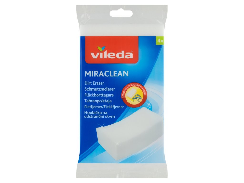 Sponge for washing most hard surfaces, e.g. in the kitchen and bathroom. Vileda Miraclean sponge easily removes stains (tea, coffee, limescale, pen marks, etc.) from most hard surfaces. Cleans with water only.