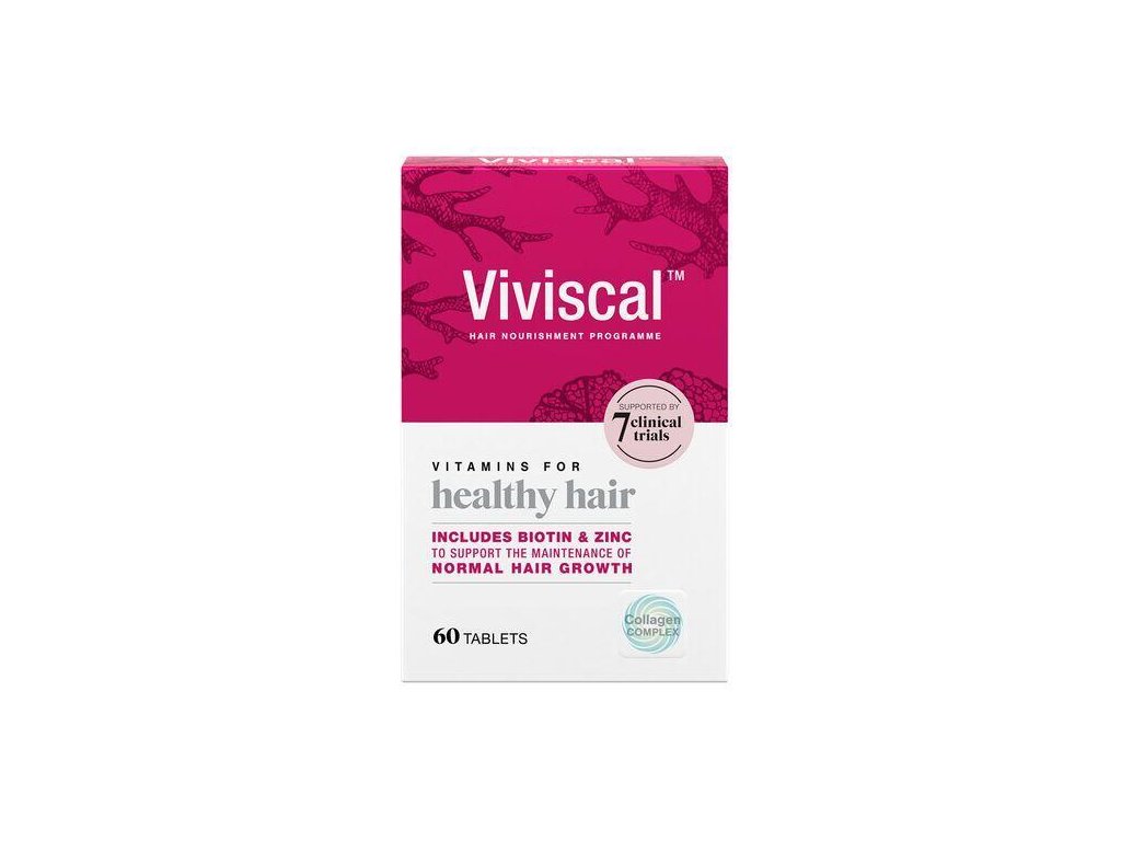 Hair growth support Dietary supplement in the form of tablets with biotin and zinc for healthy hair growth* Viviscal dietary supplements contain a scientifically formulated formula with biotin and zinc, which support normal and healthy hair growth from the inside. Viviscal supplements also contain the patented AminoMar C™ collagen complex for even better care of your hair. *Biotin and zinc also contribute to maintaining the normal condition of hair and skin. Ingredients: protein complex from marine sources AminoMar C (contains fish and shellfish), fillers: microcrystalline cellulose, cross-linked sodium carboxymethylcellulose; vitamin C (L-ascorbic acid), maltodextrin, horsetail extract (Equisetum arvense L.), ferrous fumarate, glazing agents: hydroxypropyl methylcellulose, glycerol; anti-caking agents: silicon dioxide, magnesium salts of fatty acids; zinc oxide, niacin (nicotinamide), Acerola fruit powder (Malpighia glabra L.), millet seed extract, silicon dioxide, modified starch, D-biotin. Active ingredients – amount + % RHP: AminoMar CTM (protein complex from marine sources) - 660 mg + ** Vitamin C-77 mg + 96% RHP Niacin (Vitamin B3) - 16 mg + 100% RHP Biotin - 167 µg - 334% RHP Iron - 13.6 mg + 97% RHP Zinc - 14.9 mg + 149% RHP Horsetail extract - 49 mg + ** *Daily reference value of vitamin and mineral intake (for adults). ** not established Recommended daily dose: Take two tablets daily for at least 3-6 months (1 in the morning and 1 in the evening, drink with water after meals). Warning: Keep out of reach of children. Do not exceed the recommended daily dosage. It is not a substitute for a varied diet. Maintain a varied and balanced diet and a healthy lifestyle. This product contains iron, which may be harmful to young children if consumed in excess and may cause mild stomach upset in sensitive individuals. Not suitable for pregnant or breastfeeding women. If you are taking any medication, consult your doctor about the suitability of using this dietary supplement. Do not use if the blister is cut, torn or otherwise damaged. Best before date: see date on the bottom of the package. Store and keep dry, away from heat and direct sunlight. Weight: 31.02 g (=60 tablets)Additional parameters